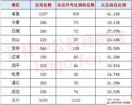 截至8日上午8:25,2017年吉林省公務員考試報名未達到開考比例職位數共1103個,較昨日減少了近1000個崗位。占2017年吉林省公務員考試全部招錄崗位的17.32%。其中松原、白山考區不足開考比例崗位最低,也相對最受考生歡迎,。不足開考比例崗位報名詳情如下: