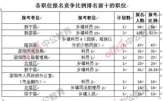 為幫助廣大考生更清晰的了解報名情況,中公教育整理了邵陽市各職位的報名人數(shù)排名以及競爭比例排名,供廣大考生參考:
