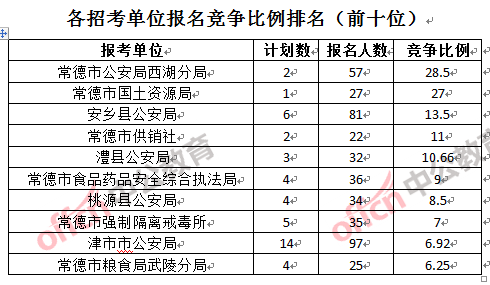 競爭熱門招考單位,前三位依次是:常德市公安局西湖分局(競爭比例28.5:1)、常德市國土資源局(競爭比例27:1)和安鄉縣公安局(競爭比例13.5:1)。