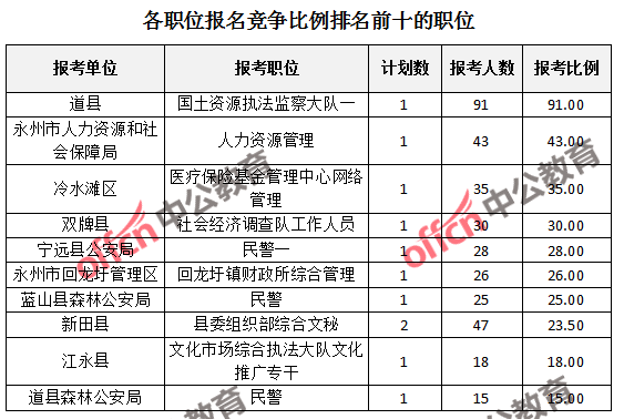 競爭熱門職位,前三位依次是:道縣國土資源執法監察大隊一(競爭比例91:1)、永州市人力資源和社會局人力資源管理(競爭比例43:1)和冷水灘區醫療保險基金管理中心網絡管理(競爭比例35:1)。