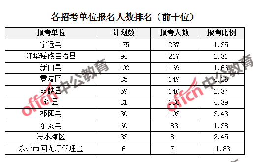 為幫助廣大考生更清晰的了解報名情況,中公教育整理了永州市各招考單位的報名人數排名以及競爭比例排名,供廣大考生參考: