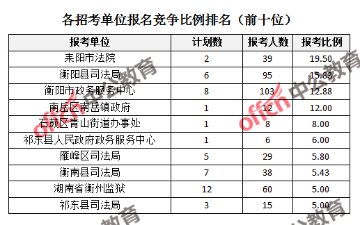 競爭熱門招考單位,前三位依次是:耒陽市法院(競爭比例19.5:1)、衡陽縣司法局(競爭比例15.83:1)和衡陽市政務服務中心(競爭比例12.88:1)。