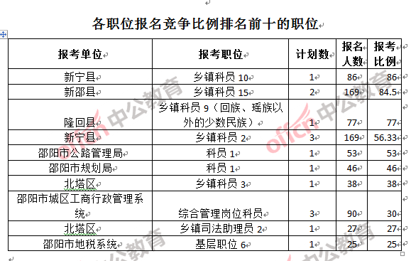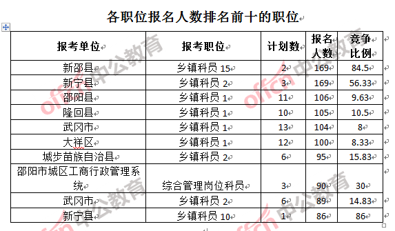 為幫助廣大考生更清晰的了解報(bào)名情況,中公教育整理了邵陽(yáng)市各職位的報(bào)名人數(shù)排名以及競(jìng)爭(zhēng)比例排名,供廣大考生參考: