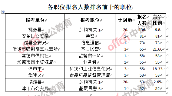 為幫助廣大考生更清晰的了解報名情況,中公教育整理了常德市各職位的報名人數排名以及競爭比例排名,供廣大考生參考: