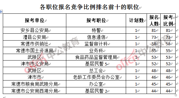 競爭熱門職位,前三位依次是:安鄉縣公安局特警(競爭比例81:1)、澧縣公安局信息通信(競爭比例73:1)和常德市供銷社監督審計科(競爭比例58:1)。