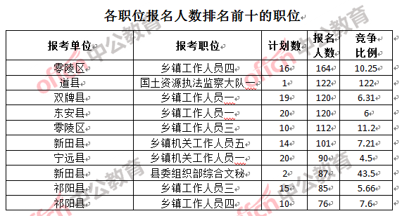 競(jìng)爭(zhēng)熱門職位,前三位依次是:道縣國(guó)土資源執(zhí)法監(jiān)察大隊(duì)一(競(jìng)爭(zhēng)比例122:1)、寧遠(yuǎn)縣公安局民警一(競(jìng)爭(zhēng)比例68:1)和冷水灘區(qū)醫(yī)療保險(xiǎn)基金管理中心網(wǎng)絡(luò)管理(競(jìng)爭(zhēng)比例63:1)。