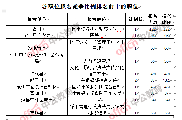 為幫助廣大考生更清晰的了解報(bào)名情況,中公教育整理了永州各職位的報(bào)名人數(shù)排名以及競(jìng)爭(zhēng)比例排名,供廣大考生參考: