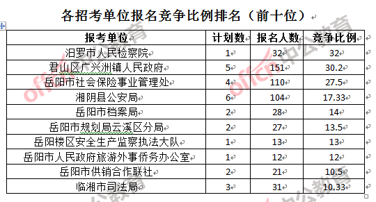 競爭熱門招考單位,前三位依次是:汨羅市人民檢察院(競爭比例32:1)、君山區廣興洲鎮人民政府(競爭比例30.2:1)和岳陽市社會保險事業管理處(競爭比例27.5:1)。