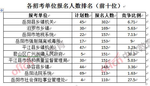 為幫助廣大考生更清晰的了解報名情況,中公教育整理了岳陽各招考單位的報名人數排名以及競爭比例排名,供廣大考生參考: