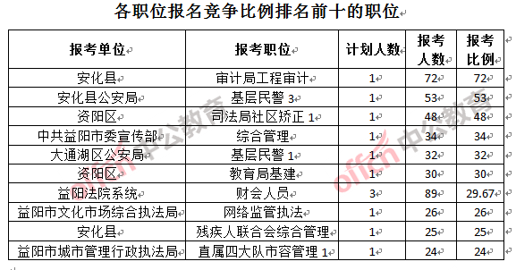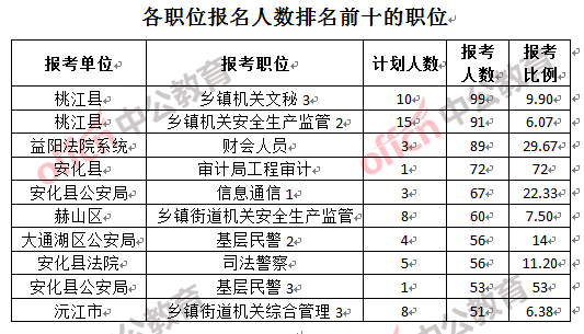 競爭最熱門職位,前三位依次是:安化縣審計局工程審計(競爭比例72:1)、安化縣公安局基層民警3(競爭比例53:1)和資陽區(qū)司法局社區(qū)矯正1(競爭比例48:1)。