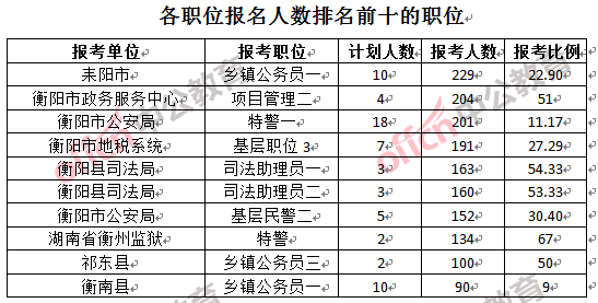 為幫助廣大考生更清晰的了解報名情況,中公教育整理了衡陽市各職位的報名人數排名以及競爭比例排名,供廣大考生參考: