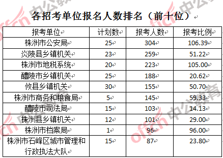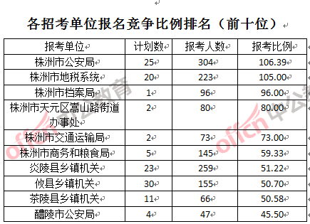 競爭熱門招考單位,前三位依次是:株洲市公安局 (競爭比例106:1)、株洲市地稅系統(競爭比例105:1)和株洲市檔案局(競爭比例96:1)。