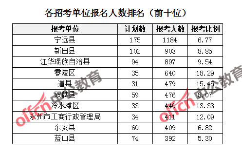 為幫助廣大考生更清晰的了解報名情況,中公網校整理了永州市各招考單位的報名人數排名以及競爭比例排名,供廣大考生參考: