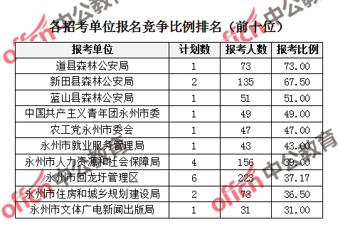 競爭熱門招考單位,前三位依次是:道縣森林公安局(競爭比例73:1)、新田縣森林公安局(競爭比例67.50:1)、藍山縣森林公安局(競爭比例51:1)。