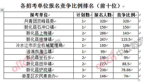 競爭熱門招考單位,前三位依次是:共青團雙峰縣委(競爭比例320:1)、新化縣石沖口鎮(競爭比例150:1)和新化縣上梅鎮(競爭比例143:1)。
