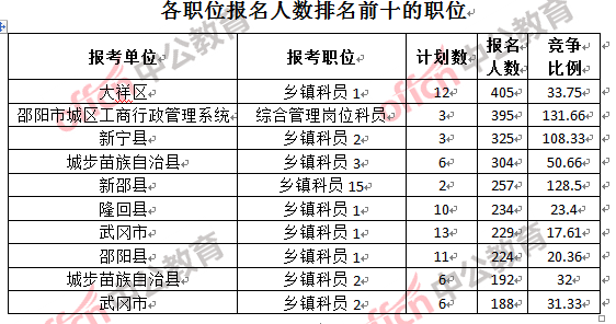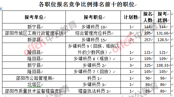競爭熱門職位,前三位依次是:新寧縣鄉鎮科員10(競爭比例144:1)、邵陽市城區工商行政管理系統綜合管理崗位科員(競爭比例131.66:1)和新邵縣鄉鎮科員15(競爭比例128.5:1)。