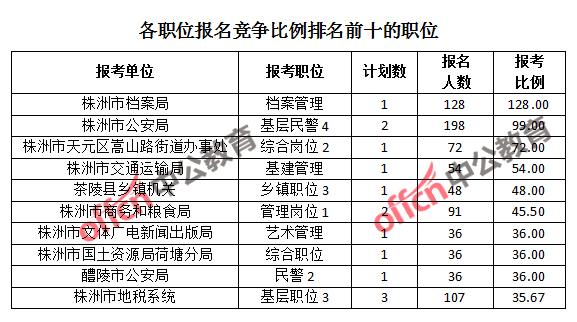 競爭熱門職位,前三位依次是:株洲市檔案局檔案管理(競爭比例128:1)、株洲市公安局基層民警4(競爭比例99:1)和株洲市天元區嵩山路街道辦事處綜合崗位2(競爭比例72:1)。