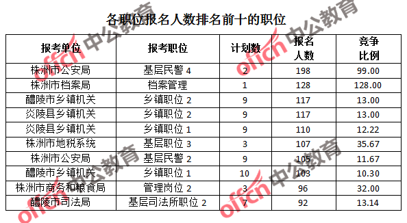 為幫助廣大考生更清晰的了解報名情況,中公網校整理了株洲市各職位的報名人數排名以及競爭比例排名,供廣大考生參考: