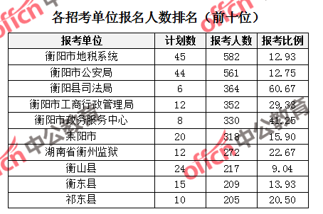 為幫助廣大考生更清晰的了解報名情況,中公網(wǎng)校整理了衡陽市各招考單位的報名人數(shù)排名以及競爭比例排名,供廣大考生參考: