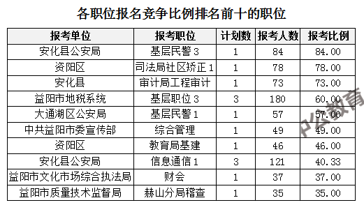 競爭熱門職位,前三位依次是:安化縣公安局基層民警3(競爭比例84:1)、資陽區司法局社區矯正1(競爭比例78:1)、安化縣審計局工程審計(競爭比例73:1)。