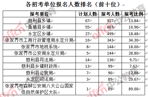 競爭熱門招考單位,前三位依次是:張家界市森林公安局八大公山自然保護(hù)區(qū)大隊(duì)(競爭比例89:1)、張家界市就業(yè)服務(wù)局(競爭比例53:1)和張家界市國土資源局永定分局(競爭比例44:1)。