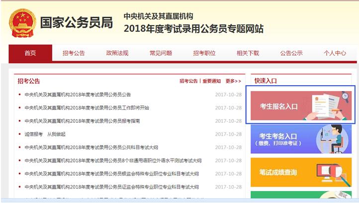 首先打開中央機關及其直屬機構2018考試錄用公務員專題信息網頁http://bm.scs.gov.cn/pp/gkweb/nps/apply/ui/business/home/gkhome.html?examkey=20180011