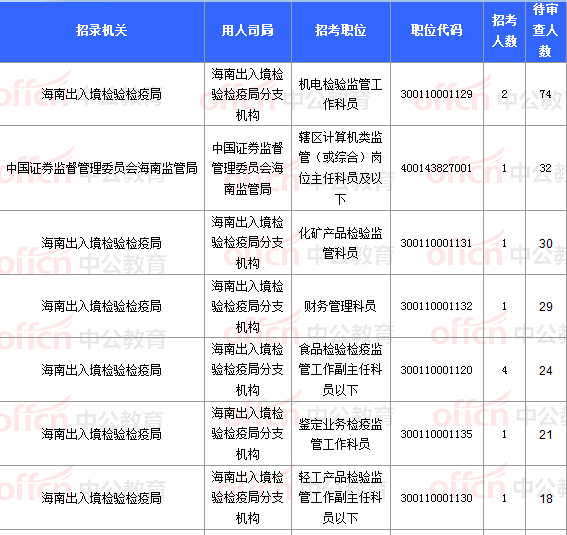 報名通過審核人數(shù)前十的職位主要集中在海南省郵政管理局、國家統(tǒng)計局海南調(diào)查總隊、海南出入境檢驗檢疫局等部門,具體信息如下: