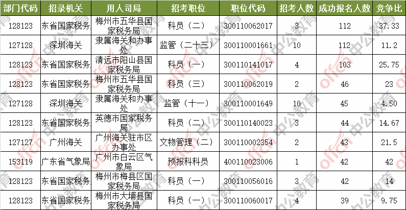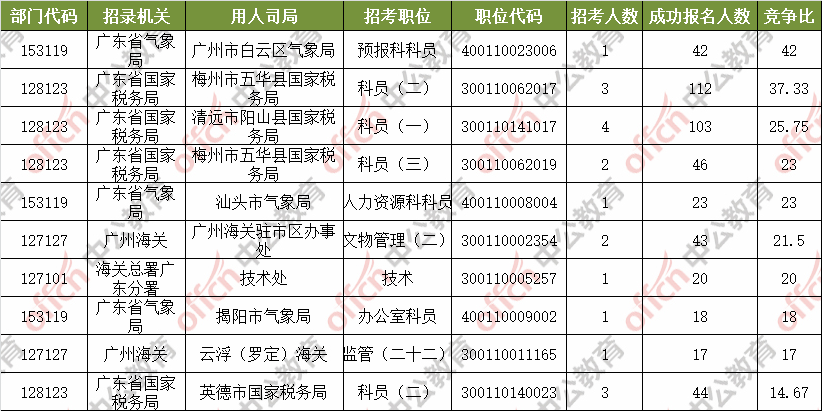 報名通過審核人數前十的職位主要集中在廣東省國家稅務局、深圳海關、廣東省國家稅務局等部門,具體信息如下: