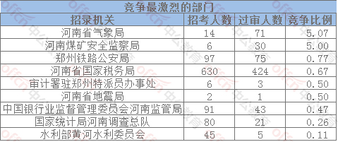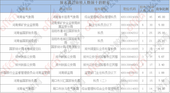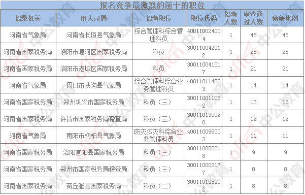 報名通過審核人數(shù)前十的職位主要集中在河南省氣象局、河南煤礦安全監(jiān)察局、河南省國家稅務(wù)局、國家統(tǒng)計局河南調(diào)查總隊等部門,具體信息如下: