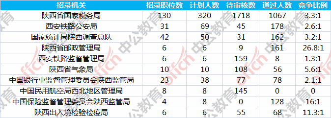 截至10月31日18時,據陜西中公教育統計,國考職位中工作地點在陜西的職位通過審核總人數為1980人,待審核人數為:2483人,平均競爭比例為3.6:1。