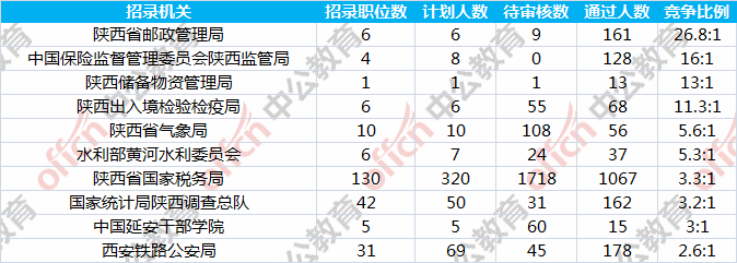 報名人數前十的職位主要集中在陜西省國家稅務局、西安鐵路監督管理局、中國保險監督管理委員會陜西監管局等部門,具體信息如下: