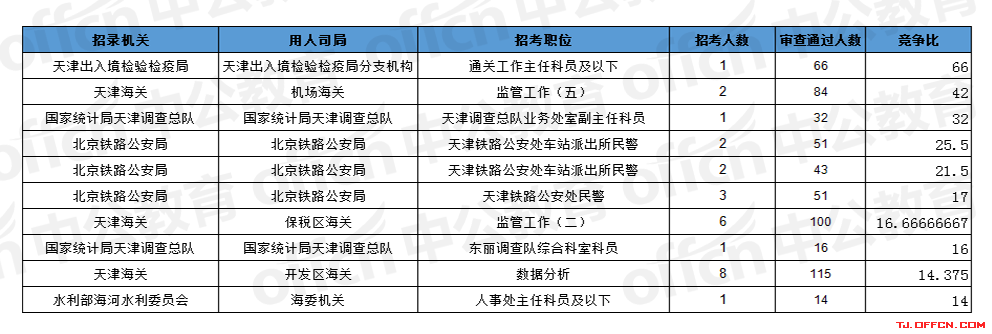 報名通過審核人數前十的職位主要集中在天津海關、北京鐵路公安局、天津出入境檢驗檢疫局等部門,具體信息如下: