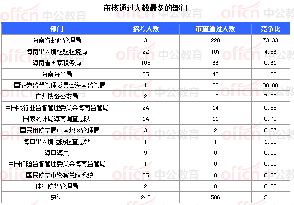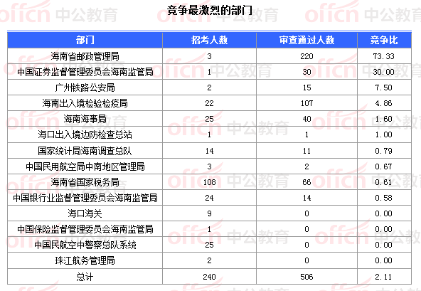 截至10月31日18時,據中公網校統計,國考職位中工作地點在海南的職位通過審核總人數為506人,共有100個職位無人通過審核,其中還有部分待審核的人數高達860人,平均競爭比例為2.11:1。