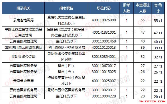 截止10月31日18時,國考報名第二天,國家統計局云南調查總隊,部門代碼:152125,直屬機關黨委辦公室主任科員及以下崗位,職位代碼:400110025008,招錄1人,審查通過人數為55人,具體信息如下: