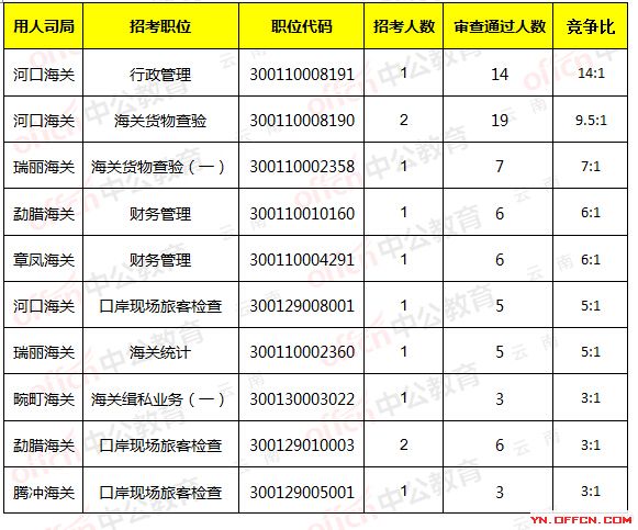 2018國家公務員海關報名人數為319人,115人審核通過。截止31日18時昆明海關河口海關的行政管理,職位代碼:300110008191,工作地點河口瑤族自治縣,招錄1人,審查通過人數為14人,待審核9人,暫時競爭比為14:1,具體信息如下: