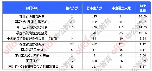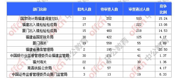 截止到1日9時(shí),通過(guò)審核人數(shù)前三位的部門(mén)依次是:國(guó)家統(tǒng)計(jì)局福建調(diào)查總隊(duì)、福建出入境檢驗(yàn)檢疫局、廈門(mén)出入境檢驗(yàn)檢疫局,三部門(mén)通過(guò)審核總?cè)藬?shù)達(dá)943人,占通過(guò)審核總?cè)藬?shù)的72.4%。