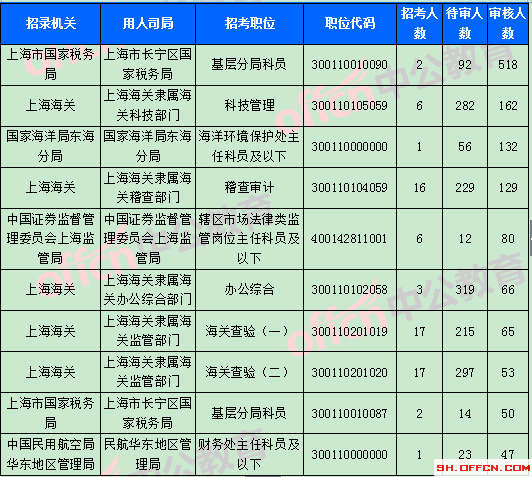 截止到1日9時,競爭比例的職位為上海市國家稅務局上海市長寧區國家稅務局基層分局科員一職,招錄2人,截止到1日9時通過人數為518人。報名通過審核人數前十的職位主要集中在上海市國家稅務局,上海海關,國家海洋局東海分局等部門,具體信息如下: