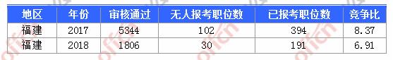 截至11月1日16時,據中公網校統計,國考職位中工作地點在福建的職位3063人待審 1806人通過審核,共報名4869人,其中有30個職位無人報名,平均競爭比例為6.91:1。
