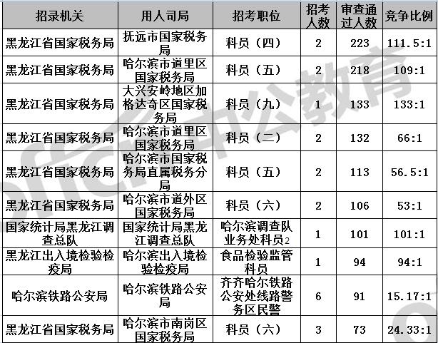 截止到11月1日16時,競爭比例的職位為黑龍江省國家稅務局大興安嶺地區加格達奇區國家稅務局科員(九)一職,招錄1人,截止到1日16時通過人數為133人。