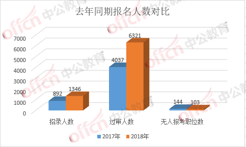 截至11月1日16時(shí),據(jù)中公網(wǎng)校統(tǒng)計(jì),2018國(guó)家公務(wù)員考試報(bào)名第三天,招錄職位中工作地點(diǎn)在湖北的職位報(bào)名人數(shù)達(dá)14475人,通過(guò)審核總?cè)藬?shù)為6321人,比去年同期審核通過(guò)人數(shù)(4037人)增加2284人,815個(gè)職位中共有103個(gè)職位無(wú)人報(bào)考,平均競(jìng)爭(zhēng)比例為4.7:1。具體信息如下: