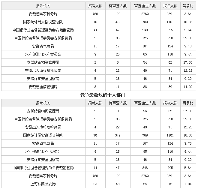 為幫助廣大考生更清晰的了解今日報名情況,中公網(wǎng)校整理了審核通過人數(shù)前十位的部門以及競爭比例最激烈的十大部門,供廣大考生參考: