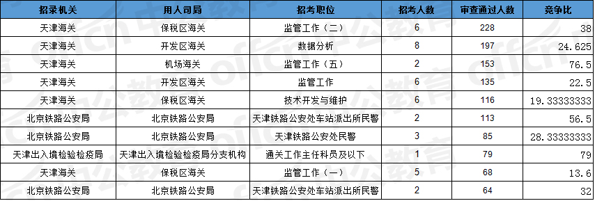 報名通過審核人數前十的職位主要集中在天津海關、北京鐵路公安局、天津出入境檢驗檢疫局等部門,具體信息如下: