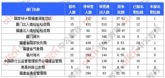 截至11月2日9時,據中公網校統計,國考職位中工作地點在福建的職位2704人待審 3148人通過審核,共報名5852人,其中有26個職位無人報名,平均競爭比例為12.06:1。