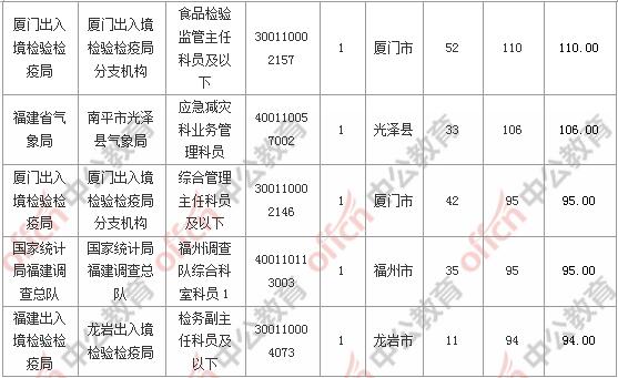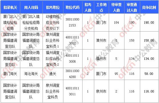 報名通過審核人數前十的職位主要集中在廈門出入境檢驗檢疫局、國家統計局福建調查總隊、廈門海關,具體信息如下: