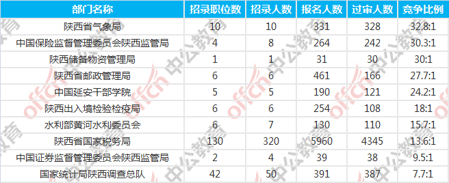 報名人數前十的職位主要集中在陜西省國家稅務局、中國保險監督管理委員會陜西監管局、陜西省氣象局等部門,具體信息如下: