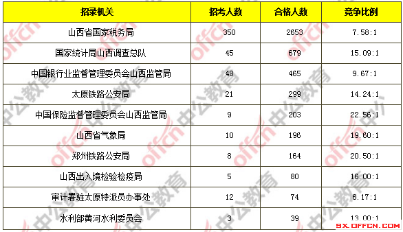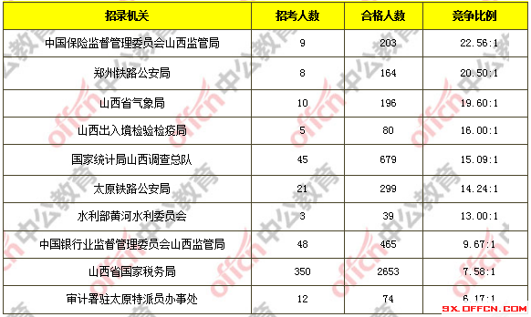 為幫助廣大考生更清晰的了解今日報名情況,山西中公教育整理了審核通過人數前十位的部門以及競爭比例最激烈的十大部門,供廣大考生參考:
