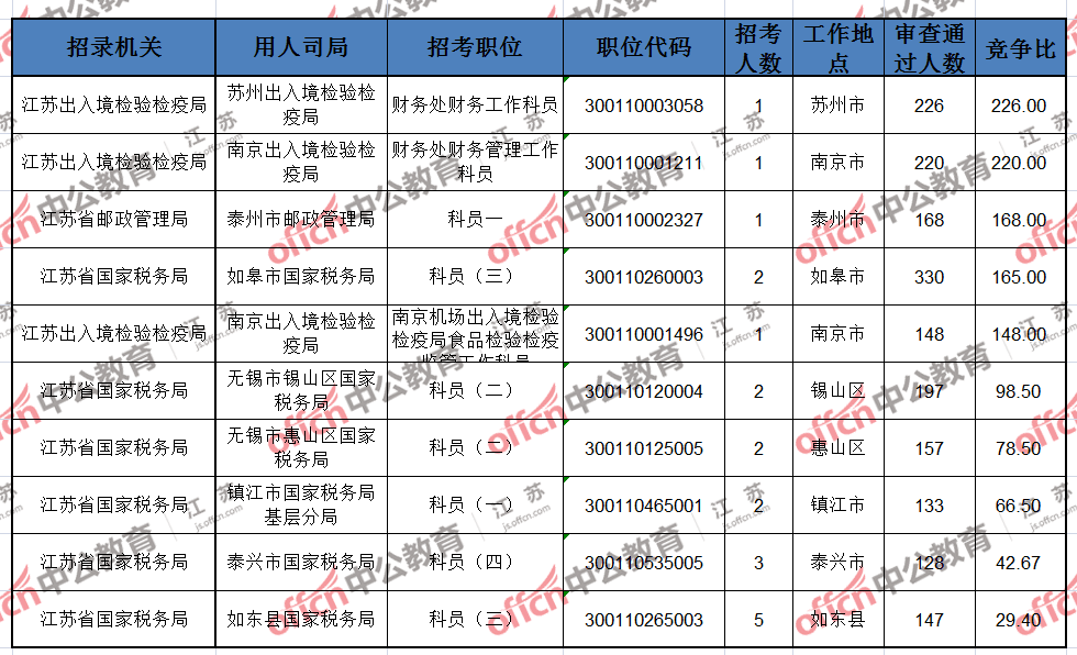 報名通過審核人數前十的職位主要集中在江蘇出入境檢驗檢疫局、江蘇省郵政管理局、江蘇省國家稅務局等部門,具體信息如下: