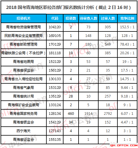 以下是2日16時(shí)各部門報(bào)名人數(shù)統(tǒng)計(jì)分析,其中青海省物資儲(chǔ)備管理局、中國民航青海安全監(jiān)督管理局、青海省郵政管理局等三個(gè)部門競爭最激烈,競爭比均超過78:1。