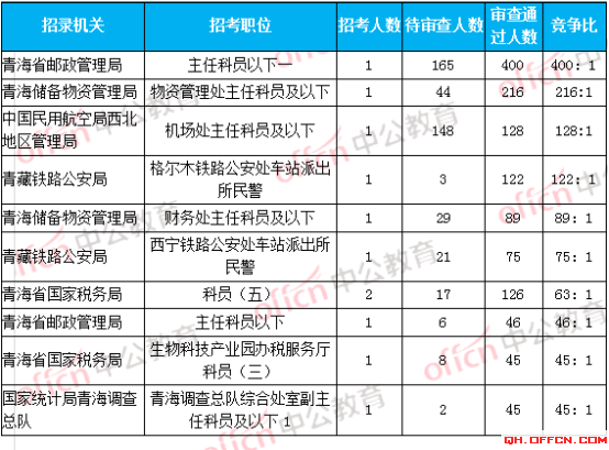 報(bào)名人數(shù)前十的職位主要集中在青海省郵政管理局、青海儲(chǔ)備物資管理局、青藏鐵路公安局、青海省國家稅務(wù)局等部門,具體信息如下: