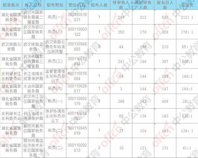報(bào)名通過(guò)審核人數(shù)前十的職位主要集中在湖北省國(guó)家稅務(wù)局、武漢鐵路公安局等部門,具體信息如下: